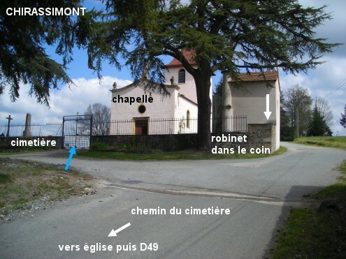 Le cimetière est situé sur les hauteurs, autour d'une chapelle, à 320 mètres de la D49. 1) Sur la D49 en provenance de Saint-Cyr-de-Valorges, avant d'arriver sur la double intersection avec la D5, en suivant les flèches ''cimetière'' tourner à droite puis à gauche, on voit alors le côté de l'église en face de soi, tourner à droite dans la rue qui monte et continuer dans une rue plus étroite qui grimpe encore (chemin du Cimetière). Vers le sommet on voit sur la gauche le parking du cimetière et le cimetière autour de la chapelle. Entrer par le portail donnant sur le parking et se diriger vers le coin avant droit pour trouver le robinet. 2) Si on a loupé la direction du cimetière ou que l'on arrive dans l'autre sens, ou encore par la D5, prendre la rue étroite (place de l'église) qui est presque dans l'axe de la D49 en provenance de Fourneaux ou de la D5 en provenance de Saint-Just-la-Pendue. Dans ce cas rouler ensuite tout droit pour prendre la rue qui longe la droite de l'église et monter jusqu'au cimetière (à 340 mètres de l'intersection D49 / D5).