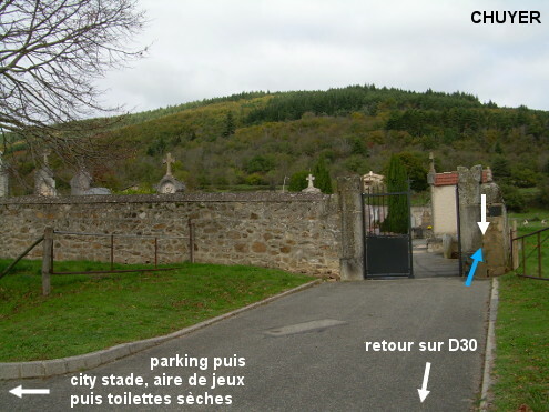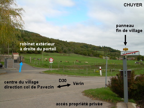 Le cimetière est desservi par une allée perpendiculaire débutant côté gauche au niveau du panneau de fin de village sur la D30 en direction de Vérin. Le robinet est à l'extérieur à droite du portail (à presque 40 mètres de la D30). N.B. : L'eau gicle fort sur ce robinet-vanne. P.S. : Il y a des toilettes sèches à proximité du cimetière et derrière le terrain de basket. Pour les trouver, entrer sur le parking à gauche de l'allée desservant le cimetière, puis entrer sur le city stade au fond et emprunter la piste de course à gauche du terrain de basket puis l'allée piétonne et aller jusqu'au bout de celle-ci pour trouver la cabane en bois des toilettes presque dissimulée près de quelques arbres.