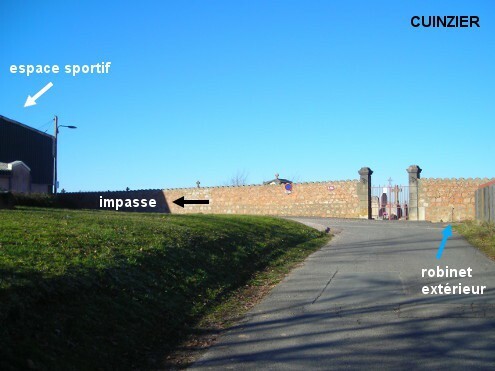 Le cimetière est situé à 270 mètres de l'intersection D39 / D70. Sur la D70 qui traverse le village en direction de Sévelinges, tourner à gauche dans la D39 direction Arcinges, puis encore à gauche 80 mètres après (rue du 8 mai 45), suivre cette rue qui fait un virage à gauche (ignorer la première petite rue à droite), puis tourner à droite en suivant le fléchage ''cimetière''. Monter dans cette ''rue du cimetière'' qui arrive en face de celui-ci (la rue perpendiculaire à gauche est un cul-de-sac, et dans l'angle côté gauche il y a un grand parking et le bâtiment de ''l'espace sportif Robert Durillon''). Le robinet est à l'extérieur, à droite du portail. N.B. : Pour repartir le plus simple est de faire le chemin en sens inverse jusqu'à la D70 car si on prend la suite de la rue du 8 mai on tombe sur plusieurs sens interdits.