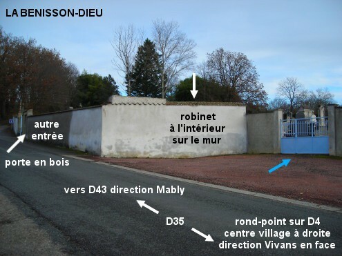 Le cimetière est situé sur la D35 (en direction de Mably via la D43) à 170 mètres du rond-point sur l'intersection D35 / D4. Sur la D35 en provenance de Vivans, continuer tout droit au rond-point précité, le cimetière est implanté côté droit un peu plus haut dans la rue de la Valbenoite, juste avant l'intersection avec l'impasse de la Lézardière (540 mètres avant le panneau marquant la fin du village). Le robinet est à l'intérieur du cimetière dans la partie la plus ancienne, sur le pan de mur de droite situé entre ses deux parties. Deux accès sont possibles. 1) Par la porte en bois à droite du portail de gauche (partie la plus ancienne du cimetière). Se diriger vers la droite jusqu'au pan de mur de séparation des deux parties du cimetière, le robinet est à gauche du cabanon qui est dans le coin droit. 2) Par le portail de droite (donnant dans la nouvelle partie du cimetière). Se diriger vers la gauche et contourner le pan de mur de séparation, le robinet est derrière.
