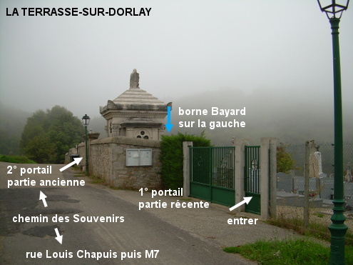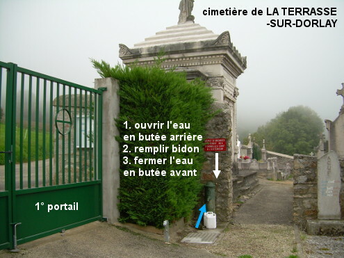 Le cimetière est situé sur les hauteurs du village dans une rue secondaire et à 470 mètres de la M7 direction Saint-Paul-en-Jarez. 1) En provenance de Saint-Paul-en-Jarez sur la M7, surveiller le côté droit de la route pour ne pas louper sur un carrefour en Y inversé la rue adjacente qui monte au cimetière et anticiper au niveau des développements ! Tourner alors en épingle à droite (rue Louis Chapuis) dans cette rue très pentue au début, on verra la flèche ''cimetière'' un peu plus haut. Passer à côté de l'église érigée côté droit, puis au carrefour en trident prendre la rue du milieu en suivant la flèche ''cimetière''. Le cimetière est implanté côté droit un peu plus loin. Il est composé de deux parties et comporte deux portails. Entrer par le portillon à droite du premier portail qui donne dans la partie la plus récente. Se diriger alors vers la gauche pour trouver une borne Bayard contre le mur mitoyen à gauche du passage reliant les deux parties du cimetière (à sept pas du portillon). N.B. : Sur cette borne Bayard, tourner la molette droite vers l'arrière (sens horaire) pour faire couler l'eau (on l'entend aussitôt arriver), puis après le plein de son bidon, ramener la molette en butée vers l'avant (sens antihoraire) pour couper l'eau. 2) En provenance de Pélussin sur la D7 qui devient M7 au col de Pavezin, peu après le carrefour à gauche avec la M76 venant de Doizieux, prendre la branche gauche montante d'un embranchement en Y en direction du cimetière (la flèche est plantée quelques mètres après le début de cette rue), et monter (pente moyenne 7%) jusqu'au cimetière comme au point 1.