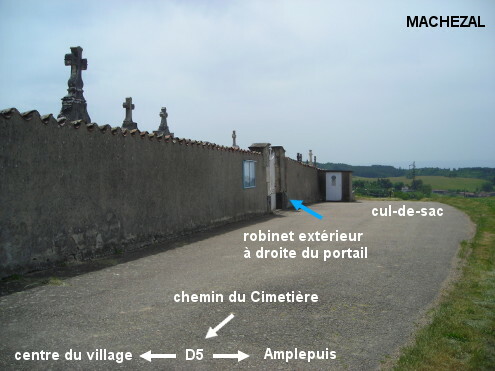 Le cimetière est situé au bout d'une rue en cul-de-sac, à 130 mètres de la D5. Sur la D5 en provenance de Chirassimont, au carrefour en T avec la D5.4 à droite, continuer sur la D5 à gauche en direction d'Amplepuis, et 90 mètres après ledit carrefour, tourner à gauche dans le chemin du Cimetière. Ce dernier est implanté côté gauche au bout de cette rue. Le robinet est à l'extérieur, à droite du portail.