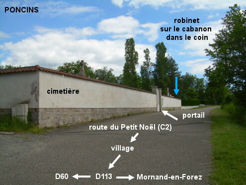 Le cimetière est situé dans une rue secondaire peu après la sortie du village, à 475 mètres de la D113. 1) En provenance de Sainte-Foy-Saint-Sulpice sur la D18, avant le village on traverse la D1089 (route à très grande circulation) : il n'y a pas de signalisation concernant la route en face, route de Bruliolles (écrit avec un double L) qui entre dans le lieu-dit Bruliole (sans double L!), mais elle conduit ensuite à Poncins (voie C1) puis passe à côté de l'église (aller toujours tout droit). Au carrefour en T plusieurs mètres après l'église, on pourra voir côté droit une ancienne plaque en faïence indiquant la D113 en direction de Mornand sur la droite. Tourner à gauche puis à droite dans la route du Petit Noël. Continuer toujours tout droit jusqu'au cimetière implanté côté gauche, 230 mètres après le panneau de fin de village sur cette voie C2. Le robinet est à l'intérieur du cimetière, contre le cabanon qui est dans le coin avant droit, sur sa face tournée vers l'arrière du cimetière (40 mètres d'allée gravillonnée à parcourir). 2) Sur la D113 en provenance de Mornand-en-Forez, peu après le carrefour à gauche avec la rue menant à l'église (fléchée), tourner à droite dans la route du Petit Noël pour trouver le cimetière côté gauche 475 mètres plus loin. P.S. : Pour éviter des routes à (très) grande circulation (D60 et surtout la D1089), ne pas prendre la suite de la D113, mais prendre la direction de l'église puis aller tout droit jusqu'à l'intersection avec la D1089 : en face c'est la D18, route tranquille qui va à Sainte-Foy-Saint-Sulpice.