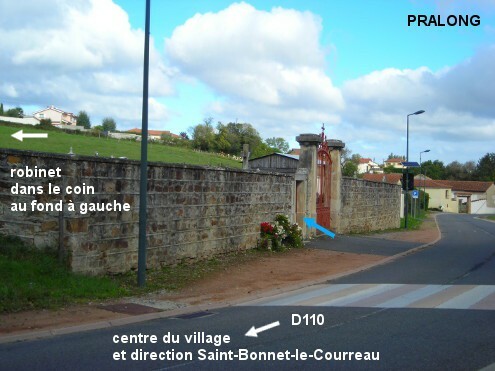 Le cimetière est implanté côté gauche à la sortie du village sur la D110 en direction de Chalain d'Uzore. Le robinet est à l'intérieur du cimetière, dans la première partie (la plus ancienne et la plus proche du centre du village), dans le coin qui est au fond à gauche (en diagonale par rapport au portillon).