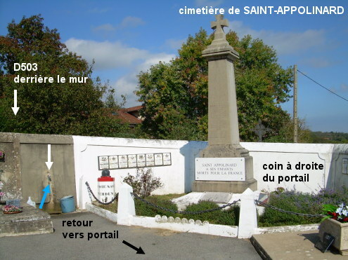 Le cimetière est situé en dehors du village à l'angle de la D503 direction Maclas (au niveau du point kilométrique 10) et de la rue traversant le centre du village. Le robinet est à l'intérieur du cimetière, dans le coin qui est à droite du portail. 1) En provenance de Maclas sur la D503 et après le lieu-dit Choron, en arrivant vers le point kilométrique 10 on verra le cimetière implanté côté gauche derrière le carrefour avec une rue adjacente (il n'y a qu'une flèche ''la croix verte'', et rien n'indique que cette rue mène au bourg si ce n'est l'église que l'on aperçoit au loin). Tourner à gauche dans cette rue des Tilleuls, entrer dans le cimetière et se diriger vers le coin à droite, dans lequel est érigée l'obélisque du Monument aux Morts. On trouvera le robinet immédiatement à gauche de l'emplacement de ce monument (à 30 mètres du portail). 2) En provenance de Saint-Julien-Molin-Molette sur la D503, traverser toute la partie du village qui est au bord de cette D503 puis 270 mètres après le panneau de fin de village, tourner à droite derrière le cimetière qui est dans l'angle du carrefour pour accéder à son portail. Entrer et se diriger vers l'obélisque dans le coin à droite pour trouver le robinet à sa gauche.