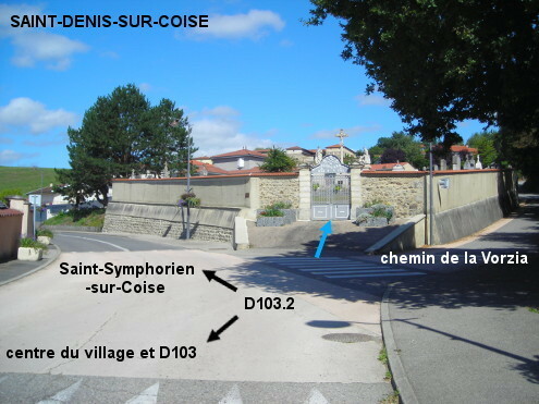Le cimetière est implanté côté droit sur la D103.2 en direction de Saint-Symphorien-sur-Coise à l'angle avec le chemin de la Vorzia, quelques mètres après le carrefour D103.2 / D103. Le robinet est à l'intérieur du cimetière, à gauche du portail.