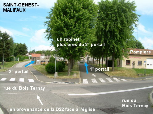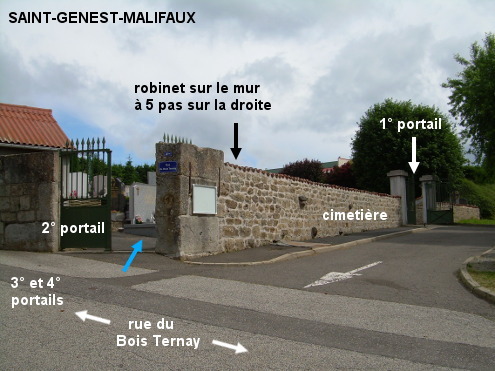 Le cimetière est situé à côté de la caserne des Sapeurs-Pompiers, dans une rue secondaire, tout près du centre-ville, à 170 mètres de la D22 qui passe devant l'église. Sur la D22 en provenance de Saint-Sauveur-en-Rue et en passant près du col de la République, au carrefour en centre-ville avec la D501, faire gauche / droite pour prendre la suite de la D22 en direction de Saint-Romain-les-Atheux. Peu après, au niveau de l'église érigée côté gauche, tourner à droite dans la rue du Bois Ternay dont le début est très étroit (et en sens unique). Au carrefour 60 mètres après, on apercevra le cimetière un peu plus loin à droite de la rue, entre la rue et la caserne des Pompiers. Une grande allée oblique à droite et bordée d'arbres conduit au premier portail du cimetière. Mais continuer tout droit sur 110 mètres pour arriver à côté du deuxième portail sis au n° 4ter vers le coin du cimetière. Entrer et faire cinq pas sur la droite (allée asphaltée) pour accéder au robinet (qui est aussi à 15 mètres du premier portail). N.B. : Plus haut dans la rue, il y a un troisième puis un quatrième portail mais leurs abords n'ont pas été explorés. P.S. : En repartant, si on ne veut pas faire à pied les 60 mètres en sens interdit (sauf riverains), on peut tourner à droite puis au carrefour en T à gauche pour arriver ensuite au rond-point sur la D22 et continuer en direction de Saint-Romain-les-Atheux.