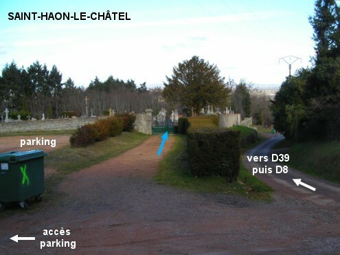 Le cimetière est situé en périphérie du bourg, à côté du ''parking Pontgibaud'', à 850 mètres de la D39. Sur la D39 en provenance de l'intersection avec la D8 (220 mètres après), à l'entrée du village tourner à droite en suivant la flèche ''cimetière'', plus loin suivre la flèche ''parking Pontgibaud'' quand la route vire perpendiculairement à gauche (ignorer les deux chemins à droite). Après que la route aura commencé à monter (et avant le carrefour avec une rue en sens interdit en face), tourner à droite sur le parking en terre battue et à 180° pour se retrouver face à l'allée bordée de haies arbustives menant au portail du cimetière. Le robinet est à l'intérieur du cimetière, dans le coin à droite du portail.