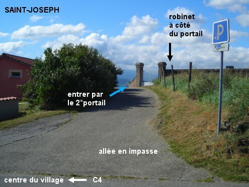 Le cimetière est situé à la sortie du village sur une petite route menant à des lieux-dits. A partir du centre du village, sur la D30 en direction du nord (vers Sainte-Catherine), après avoir passé l'église côté droit, tourner dans la première rue à gauche (après 90 mètres et à côté du n° 35), continuer pendant 350 mètres dans cette ''route du Mas''. On verra alors sur la gauche le panneau carré bleu indiquant le parking situé au fond de l'allée en impasse qui dessert le cimetière (dans l'autre sens de circulation, l'allée est juste avant le panneau de début du village). Le cimetière est implanté côté droit dans ladite allée à une vingtaine de mètres. Entrer par le deuxième portail, se diriger vers la droite pour atteindre le premier portail (cadenassé avec un chaîne) car le robinet est à l'intérieur à la gauche de ce premier portail. N.B.: Si l'on continue dans la route du Mas en suivant la direction du lieu-dit Le Mas, on finit par arriver à Saint-Martin-la-Plaine (que l'on tourne à gauche ou à droite dans Popenot).