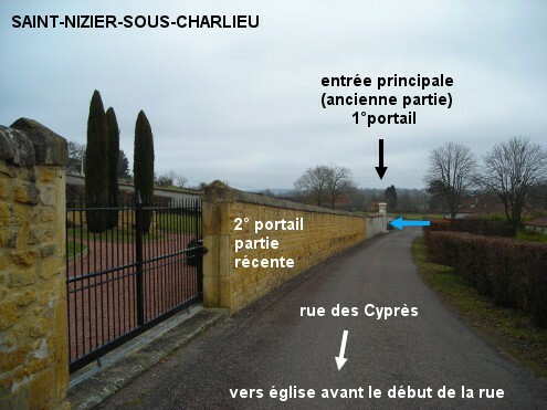 Le cimetière est implanté au bout d'une rue en impasse qui débute à côté de l'église, il est situé à 240 mètres de la D4. Sur la D4 en direction de Charlieu, regarder à gauche, lorsque l'on voit la flèche jaune ''relais La Poste'' tourner dans cette rue, l'église est en face quelques mètres plus loin (en sens inverse sur la D4, il n'y a pas de flèche, mais l'église se voit mieux). En arrivant vers l'église, tourner à droite dans la rue des Cyprès (devant un parking) et aller jusqu'à son extrémité où cette rue en cul-de-sac se transforme en place avec espace de stationnement. Entrer par le portillon à côté du portail principal (celui de droite, plus ancien) pour trouver à l'intérieur du cimetière une borne Bayard à droite du portillon, entre celui-ci et le portail. Il s'agit du modèle avec molette sur la droite, qu'il faut actionner d'arrière en avant dans un mouvement de va-et-vient, pendant relativement longtemps ici, pour faire couler l'eau.
