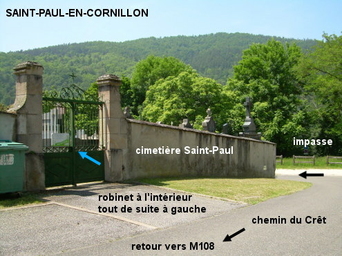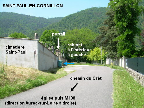 Le ''cimetière Saint-Paul'' se trouve dans la rue qui passe à côté de l'église, à 370 mètres de la M108. 1) En provenance d'Aurec-sur-Loire sur la D46 qui devient M108 en changeant de département, au carrefour avec la rue qui dessert le bourg de Saint-Paul, prendre la branche gauche du Y en suivant les flèches ''église'' et ''cimetière Saint-Paul''. Au carrefour suivant, continuer tout droit, dépasser l'église érigée côté gauche, et poursuivre jusqu'au cimetière implanté côté gauche (juste avant le coude à gauche de la rue qui devient ''voie sans issue'' d'après le panneau). Le robinet est à l'intérieur du cimetière tout de suite à gauche du portail. N.B. : Il faut ouvrir doucement ce robinet-vanne pour éviter que l'eau ne gicle trop fort. 2) En provenance de Chambles sur la M108 (nouvelle appellation de la D108), au carrefour en T avec la M3 tourner à gauche pour franchir le pont du Pertuiset sur la Loire puis au rond-point tourner à droite dans la suite de la M108 en direction du village. Ignorer la première rue à droite en direction de ''Saint-Paul'', continuer tout droit et après le panneau ''Saint-Paul-en-Cornillon'', sur l'extérieur d'une courbe à gauche, tourner à droite en épingle en direction du ''cimetière Saint-Paul'' (parmi plusieurs petites flèches) et rouler tout droit jusqu'au cimetière.