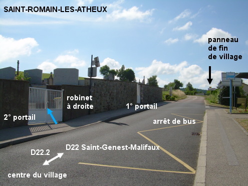 1) Le cimetière est implanté côté droit à l'entrée du village sur la D22.2 quand on arrive en provenance de Saint-Genest-Malifaux sur la D22, tout de suite après le panneau de début de village. Le robinet est à l'intérieur du cimetière à droite du deuxième portail (celui de gauche, à 430 mètres de la D22), il est surmonté d'un écriteau ''eau potable''. 2) En venant du Chambon-Feugerolles sur la D22 puis la D22.2, traverser tout le village : la rue principale vire à gauche devant l'église puis vire à droite autour de la Mairie sise côté droit. Plus loin on arrivera vers le cimetière implanté côté gauche. Entrer par le portail le plus proche (celui de gauche) pour trouver le robinet. P.S. : Pour ceux qui en auraient besoin, il y a des toilettes dans le même bâtiment que la Mairie, à droite de son entrée, mais elles ne sont pas en libre-service : il faut demander la clef à l'accueil de la Mairie ou à la boulangerie qui est à gauche de la rue et presque en face de la Mairie.