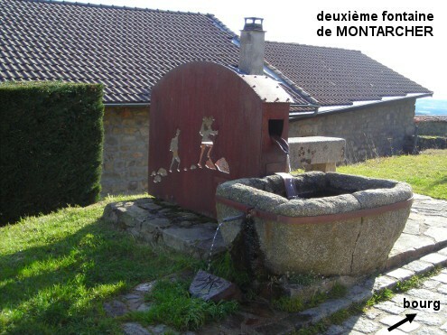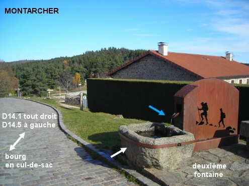 Cette deuxième fontaine dans ce village piétonnier perché (point de vue avec table d'orientation) et en cul-de-sac, est implantée sur le bord gauche de la rue principale peu après l'unique entrée du village (et après une première fontaine côté droit). Elle est reconnaissable à son habillage en tôle dans lequel sont découpées deux silhouettes de randonneurs gravissant un chemin. AVERTISSEMENT : Cette fontaine n'est accompagnée d'aucun écriteau se rapportant à sa potabilité, contrairement à la troisième fontaine située plus haut, mais elle a un débit beaucoup plus élevé, et on peut supposer que si elle n'était pas consommable, il y aurait un écriteau d'interdiction, d'autant plus qu'elle est située dans un village pittoresque très touristique.