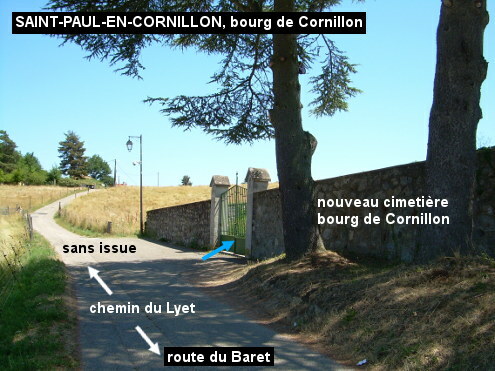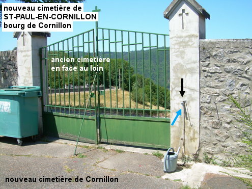 Le nouveau cimetière de l'ancien bourg de Cornillon sur la commune de Saint-Paul-en-Cornillon est situé sur les hauteurs à 1,03 km de la M108 (à réserver aux grimpeurs et amateurs de détours). En provenance de Chambles sur la M108 (au carrefour avec la M3, tourner à gauche pour franchir le pont du Pertuiset sur la Loire puis au rond-point juste derrière tourner à droite dans la suite de la M108), lorsque l'on verra le viaduc côté gauche, tourner à gauche pour passer en-dessous et entrer dans la partie du village correspondant à l'ancien bourg de Cornillon. Monter dans la route du Baret pendant 950 mètres (pente 8,4%), on arrivera alors à un carrefour en croix avec en face (il y a aussi un panneau voie sans issue) la direction du nouveau cimetière. Celui-ci est implanté côté droit 85 mètres plus loin. Le robinet est à l'intérieur du cimetière, à gauche du portail. N.B. : Il faut appuyer très fort sur le bouton-poussoir du robinet.