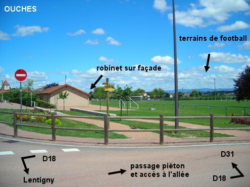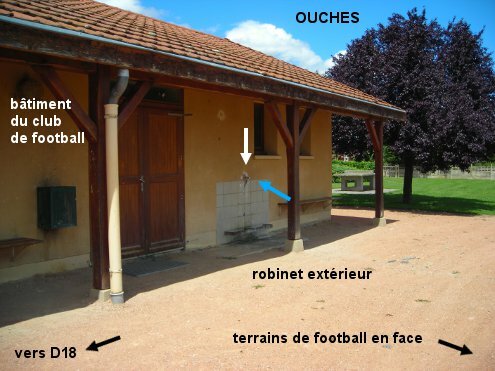 Le robinet est fixé sur l'extérieur du bâtiment du football club d'Ouches, implanté presque en face de la Mairie, à l'angle de la rue des écoles et de la route de Villerest, au bord de la D18 direction Lentigny. 1) Sur la D18 en provenance de Lentigny, on arrive face au sens interdit de la rue des écoles, la Mairie est à gauche et le bâtiment du club de football à droite au début de cette rue. Donc tourner à droite dans la route de Villerest et aussitôt emprunter le passage piéton pour traverser et rejoindre l'allée en terre battue qui longe la façade du bâtiment du club de football située face aux terrains. Le robinet se trouve vers l'extrémité de cette façade. 2) A partir de la D31 en provenance de Saint-Alban-les-Eaux, tourner à droite soit dans la rue des écoles en direction de la Mairie, soit dans la suivante (rue Saint-Georges) en suivant la flèche D18 Lentigny, puis continuer à droite dans la route de Villerest (suite de la D18) pour faire le tour du rectangle comportant les terrains de football et trouver au niveau du carrefour en T le bâtiment du club sur la droite.