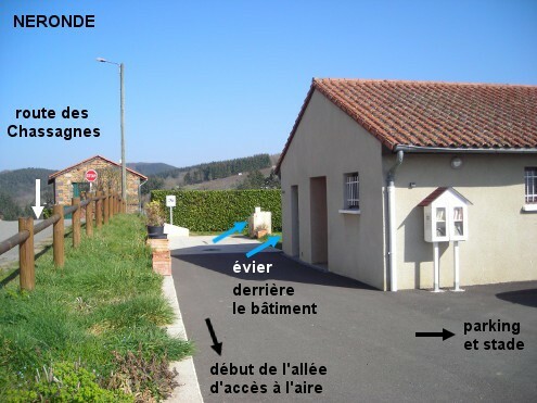 L'aire de camping-car est indiquée par un fléchage dédié (on peut également suivre la direction du stade). A partir du centre-ville, prendre la D83 direction Rozier-en-Donzy, puis tourner à droite (direction "stade"), on arrive à un carrefour à quatre branches avec une Madone. Soit suivre le fléchage "aire des Chassagnes" qui fait faire un long tour par la gauche (plusieurs intersections bien fléchées), puis on arrive route des Chassagnes et après les terrains de football à droite, il y a (face au n°2) la voie d'accès à l'aire de camping-car quelques mètres avant le panneau stop. Soit prendre un raccourci à droite de la statue (pas l'épingle à droite mais la rue à peu près en face) qui est un vrai raidard (montée du stade), au sommet on voit le panneau stop du sens inverse qui protège l'intersection avec la rue de la Petite Grange à notre droite (l'aire de camping-car dans ce cas est à gauche). Il y a un évier extérieur à l'arrière du bâtiment (en le regardant quand on arrive sur le site) dans le coin gauche, en face du bloc ciment aire-service avec deux robinets munis de tuyaux. N.B.: Etant donné qu'en général sur les aires pour camping-cars un seul des deux robinets délivre de l'eau potable (le deuxième étant de l'eau pour le rinçage) et qu'il n'y a ici aucun écriteau précisant lequel est celui d'eau potable ou si les deux sont raccordés au réseau d'eau potable, dans le doute préférer se servir à l'évier, ce qui est en outre plus pratique pour remplir ses bidons de cycliste.