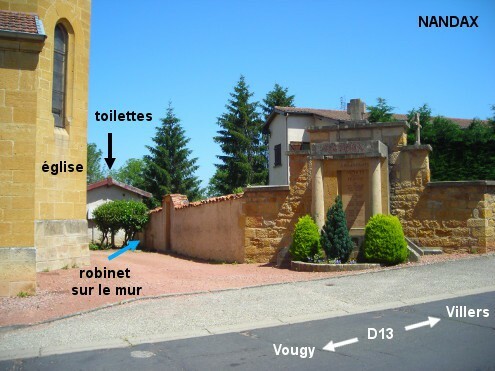 Le robinet est fixé sur le mur qui est à droite de l'église, juste avant le cabanon des toilettes. Sur la D13 en direction de Villers, prendre à gauche l'allée en terre battue entre l'église et le Monument aux Morts (face au n° 90 de la rue). Le cabanon des toilettes est au fond, et le robinet est sur le mur longeant l'allée à droite, vers les arbrisseaux. N.B. fermeture hivernale prolongée.