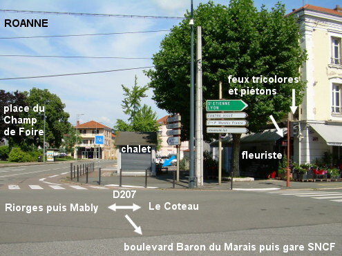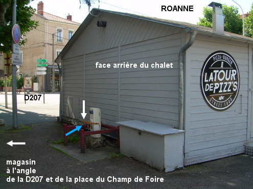 Ce robinet se trouve au bord de la place au fond de laquelle il y a le Centre des Impôts, et qui est située au bord de la D207 (ex-RN7 qui relie Le Coteau à Mably en passant par Roanne et Riorges) dans le quartier ''faubourg de Paris''. Il est implanté près de la D207 derrière un chalet en bois installé sur le trottoir. 1) Au sortir de la gare SNCF, aller à gauche puis au rond-point prendre la première sortie (boulevard Baron du Marais, bande cyclable) et continuer tout droit jusqu'aux feux. On est alors à l'intersection avec la D207 et face à la place du Champ de Foire. Traverser la D207 sur le passage piéton pour arriver sur le trottoir en face à côté du chalet en bois (actuellement occupé par un pizzaïolo). Le robinet est fixé sur un support bas entouré de mini barrières métalliques de protection situé près du dos du chalet, donc entre ce chalet et le magasin qui est à l'angle des deux rues (un fleuriste en 2024). 2) En provenance du Coteau sur la D207, au rond-point après le pont sur la Loire, prendre la deuxième sortie en direction de la Médiathèque (et de Riorges, bande cyclable). Continuer tout droit pendant un long moment (un rond-point puis des premiers feux, on passe ensuite à côté de la Médiathèque), aux deuxièmes feux tricolores on sera à côté du chalet en bois installé sur le trottoir de droite face à la rue adjacente. Le robinet se trouve tout près de sa face arrière située en regard du magasin qui est à l'angle.