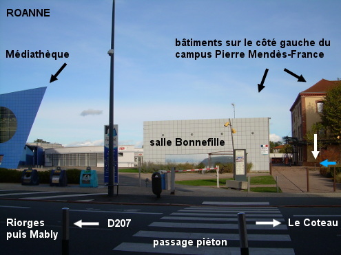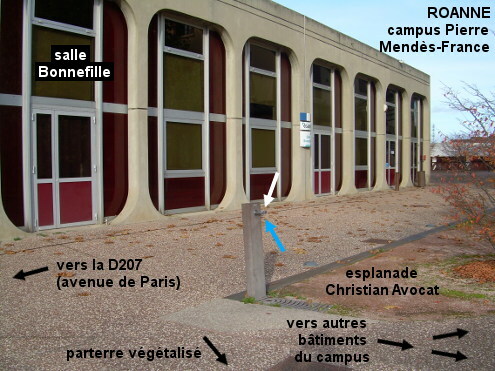 Ce robinet est fixé sur un support près de la salle Bonnefille située sur le côté gauche du Campus Pierre Mendès-France qui est à droite de la Médiathèque (fléchée et très facile à repérer) sise au bord de la D207 (ex-RN7 qui traverse la ville). 1) En provenance du Coteau sur la D207, au rond-point après le pont sur la Loire, prendre la suite de la D207 : deuxième sortie en direction de la Médiathèque (bande cyclable). Continuer tout droit pendant un long moment (passer un rond-point) puis peu après les feux tricolores on arrivera à hauteur du campus (identifié par une inscription en grosses lettres devant un parterre végétalisé) situé côté droit juste avant la Médiathèque à l'imposante silhouette bleue de paquebot. Continuer jusqu'au deuxième passage piéton situé entre l'arrêt de bus et la Médiathèque. Entrer sur l'allée piétonne perpendiculaire à la rue et avancer jusqu'à la salle Bonnefille (identifiée par une plaque sur son pignon face à la rue) située à gauche de l'allée, à ce moment-là on trouvera le robinet à droite de l'allée. 2) Au sortir de la gare SNCF, aller à gauche puis au rond-point prendre la première sortie (boulevard Baron du Marais, bande cyclable) et continuer tout droit jusqu'aux feux. Là tourner à droite dans la D207 et quelques mètres plus loin, peu après la Médiathèque bleue sise côté gauche, traverser sur le passage piéton pour prendre l'allée menant à la salle Bonnefille et trouver le robinet sur la droite.