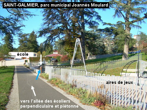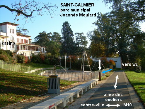 Ce robinet se trouve à côté de deux aires de jeux à l'intérieur du parc municipal Joannès Moulard situé au bord de la M10. 1) En provenance de Bellegarde-en-Forez sur la D10 (qui devient M10, nouvelle appellation), faire attention : au deuxième rond-point il faut virer à 180° à droite pour la suite de la M10. Environ 120 mètres après les feux tricolores au carrefour avec la D6 venant de Cuzieu, mettre pied à terre et traverser vers la gauche sur le passage piéton pour monter ensuite pendant 40 mètres dans l'allée des écoliers qui est piétonne (et pentue !). Tourner alors à droite dans l'allée plane perpendiculaire pour trouver le robinet sur un support côté gauche 40 mètres plus loin face au coin de l'enceinte de la deuxième aire de jeux. N.B. : Il faut appuyer fort sur le bouton-poussoir pour faire couler l'eau. P.S. : L'allée des écoliers débouche près de La Poste en centre-ville. 2) Si on a loupé ce premier accès au parc dans lequel il y a aussi le casino, on peut utiliser le deuxième accès 140 mètres plus loin face au passage piéton situé après le panneau annonçant un rond-point (celui M10 / M12). Entrer par le portillon du portail et monter sur l'allée à gauche puis à la jonction en T avec une autre allée, continuer quelques mètres sur la gauche pour trouver le robinet après la première aire de jeux que l'on voit à droite. Dans ce sens le robinet est fixé sur le côté du support qui nous fait face.