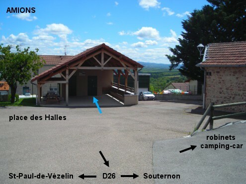 Les toilettes sont situées côté gauche sur la D26 en direction de Souternon, derrière un parking sur une grande place et sous une halle couverte, donc très en retrait par rapport à la route, en face d'une rue desservant le centre du village (rue de la Cure).
