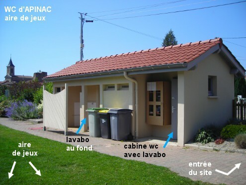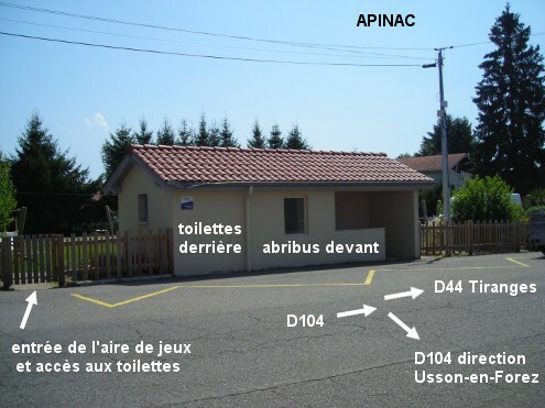Ces toilettes sont situées sur une aire de jeux à côté du carrefour D104 / D44. Sur la D104 en provenance de Saint-Maurice-en-Gourgois, on verra sur la gauche (en face du n°61 route de Saint-Maurice) le bâtiment qui abrite côté rue un abribus et côté aire de jeux des toilettes, juste avant que la D104 ne fasse un virage à angle droit sur la droite en direction d'Usson-en-Forez, tandis qu'en face il y a la D44 direction Tiranges (et Saint-Pal-de-Chalençon). Entrer sur le site de l'aire de jeux par le portillon à gauche du bâtiment pour accéder aux toilettes qui sont sur l'arrière du bâtiment. N.B. : Dans la cabine WC accessible aux handicapés, située sur la droite, le lavabo est large mais peu profond, et le lavabo extérieur (au fond derrière le paravent) est relativement petit.