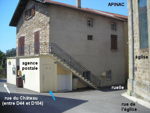 Ces toilettes sont situées face à l'arrière de l'église, à côté de l'agence postale (sise au n° 203). A partir de l'intersection D104 / D44, prendre la rue du Château en direction du bourg et de la Mairie. Au niveau de l'agence postale côté gauche à l'angle de la rue du Château et de la rue de l'église, tourner à gauche. Les toilettes sont au coin à droite de l'agence postale (N.B.: sa direction est indiquée à partir de la D44 avant d'arriver sur la D104), au début de la ruelle entre l'agence postale et l'arrière de l'église. Dans la cabine WC turc, il y a un robinet-vanne muni d'un tuyau (assez loin du sol).