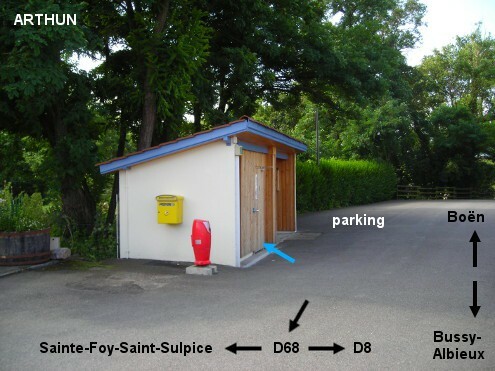 Le petit bâtiment qui abrite les toilettes est implanté sur un parking à côté de l'intersection D68 / D8 qui se trouve face à la Mairie. Sur la D8 en provenance de Bussy-Albieux, après l'intersection à droite avec la D68 direction Sainte-Sixte, sur la gauche à l'angle derrière la D68 direction Sainte-Foy-Saint-Sulpice, et en face de la Mairie en surplomb côté droit, il y a ce parking dont l'accès se fait par la route de Biterne (D68).