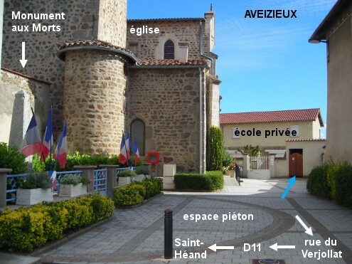 Les toilettes sont situées au fond d'une allée piétonne, à droite de l'église. A partir de la D11 en provenance de Chazelles-sur-Lyon, au niveau d'un virage à gauche, tourner à droite (dans la rue du Verjollat) en suivant la direction de l'église et de la Mairie. Quelques mètres après, tourner à gauche dans l'allée piétonne, longée sur sa gauche par un bâtiment puis le Monument aux Morts puis l'église. En face il y a le portail d'une école catholique (au n°4), et à sa droite la porte à battants en bois des toilettes.