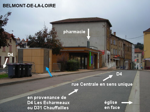 Le petit bâtiment des toilettes est implanté sur une place au centre du village, située entre deux rues (dont l'une est une portion de la D4), et en regard du côté de l'église. Deux accès sont possibles. 1) Sur la D4 en provenance de Charlieu, après l'intersection sud avec la D31 direction Cours-la-Ville, continuer à gauche sur la D4 (direction Les Echarmeaux, et direction Chauffailles par la D31). Au bout de cette rue de la fontaine, après la façade arrière d'une pharmacie et avant un rond-point, on verra côté gauche la place sur laquelle est implanté le bâtiment des toilettes, au bord de la rue Centrale qui est parallèle à la rue de la fontaine. 2) En arrivant du nord, soit par la D31 en provenance de Chauffailles, soit par la D4 en provenance du col des Aillets, au premier rond-point continuer sur la D4 vers la gauche (en direction de Charlieu, ou de Cours-la-Ville par la D31) et sitôt après au deuxième rond-point continuer en face (pas de fléchage) dans la rue Centrale qui longe la gauche de l'église. On trouvera le bâtiment des toilettes sur la place côté gauche et au bord de la rue, juste avant la pharmacie. P.S. : En octobre 2022, les anciennes toilettes ont été remplacées par une cabine WC à nettoyage automatique concernée par une fermeture de 22h à 6h.