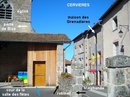 Les toilettes sont situées dans la cour de la salle des fêtes, à côté de l'église, en plein coeur du bourg médiéval (secteur piéton en été). Sur la D24.1 en provenance de Noirétable, au carrefour en Y rentrer à droite dans le village par la Porte de Bise (arche dans les remparts ceinturant le bourg). Aller jusqu'au bout de la rue du Puy Magnol, passer à droite de l'église (sens obligatoire) puis aussitôt au carrefour en T à droite dans la rue Marchande. L'entrée dans la cour de la salle des fêtes est immédiatement sur la droite (à 150 mètres de la Porte de Bise). La cabine WC est sur la droite contre le mur mitoyen avec la rue. En plus du lavabo dans ladite cabine, il y a deux robinets d'eau potable à proximité immédiate. Le deuxième est fixé au mur côté cour à droite de la cabine WC, le premier est au même niveau mais côté rue (un écriteau en hauteur précise que l'eau est bien potable). N.B.: Pour quitter le village, redescendre la rue Marchande jusqu'à la deuxième porte dans les remparts (à 120 mètres des toilettes), et plus loin au carrefour en T tourner à droite (aucune indication) pour rouler en direction des Salles.