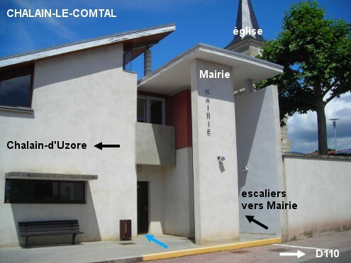 Les toilettes sont situées sur le côté et en bas du bâtiment de la Mairie dont la façade donne sur la grande "place de la Mairie" en surplomb de la route (sur cette place il y a aussi l'église). Sur la D110 en provenance de Chalain d'Uzore, les toilettes (en face du n° 49 route du Forez) sont sur le côté gauche après un parking et avant l'intersection avec la place de la Mairie à gauche et la route de Fontannes à droite.