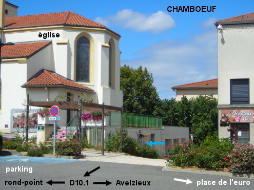 Les toilettes se trouvent en contrebas de l'arrière de l'église, derrière un parking situé à côté du rond-point où il y a la Mairie. En provenance de Veauche ou Saint-Galmier par la D10 puis D10.1, au rond-point précité tourner à gauche en direction d'Aveizieux (rue Jules Ferry qui est la suite de la D10.1) puis immédiatement à gauche sur le grand parking (à sa droite il y a une grande place arborée). Se diriger vers le fond du parking, descendre dans l'allée entre l'église et un commerce, la porte des toilettes est au début de ladite allée côté gauche.