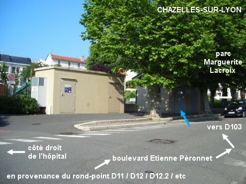 Ces toilettes sont situées en centre-ville entre l'hôpital local et le parc Marguerite Lacroix, à 180 mètres du rond-point à six branches de la place des Portes sis à l'intersection des routes D11, D12, D12.2 et de deux autres rues. A ce rond-point, suivre la direction de l'hôpital et prendre ainsi la rue de l'Abbé Nanty, courte rue à sens unique qui, après l'intersection à gauche avec la rue qui dessert l'entrée de l'hôpital, se prolonge en boulevard Péronnet. Le bâtiment des toilettes est implanté sur le trottoir gauche (face au n°19) entre les deux premiers arbres (en été le feuillage touffu dissimulerait presque ledit bâtiment) juste après la fin du côté droit de l'hôpital et au niveau du début du grand parc précité. La porte de gauche donne dans une grande cabine WC avec un lavabo dans lequel l'écoulement de l'eau est commandé par une cellule à détection (bien avancer les mains sous l'orifice). N.B. : Pour parvenir au rond-point de la place des Portes (décoré d'un mini bâtiment avec une tour ronde en briques rouges), il suffit de suivre les indications ''centre-ville'', sauf si l'on arrive de l'Est (D12 en provenance de Grézieux-le-Marché ou D103 en provenance de Saint-Denis-sur-Coise), parce qu'alors les flèches ''centre-ville'' mènent à la grande place en bordure de la D103. Dans ce cas, il faut d'abord prendre la direction de la Mairie puis repérer sur la droite le grand parc et tourner juste derrière dans le boulevard Péronnet vers la fin duquel on trouvera les toilettes côté droit dans ce sens.