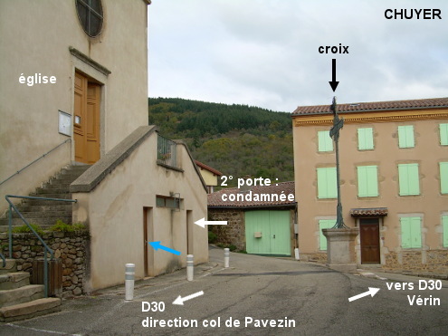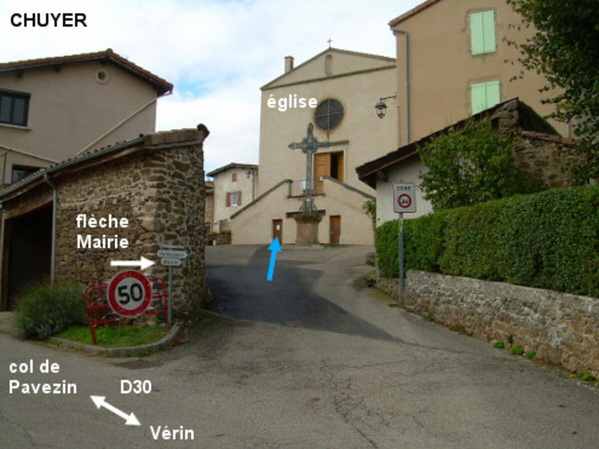 Les toilettes se trouvent dans le mur de soutènement devant l'église érigée à quelques mètres de la D30. 1) Sur la D30 en provenance de Vérin, tourner dans la deuxième à droite (juste après un abribus) en direction de la Mairie (fléchée), on découvrira alors l'église en face un peu plus haut. Devant celle-ci, dans le mur de soutènement de deux séries d'escaliers de part et d'autre, on verra deux portes en bois non identifiées. Il s'agit de celles des toilettes qui donnent dans le même local, mais seule celle de gauche est en service (à 40 mètres de la D30). 2) Sur la D30 en provenance du col de Pavezin, dans le centre du village prendre la branche gauche du carrefour en Y qui mène à l'église. La première porte côté gauche sous les escaliers montant vers le portail de l'église est celle qui s'ouvre sur les toilettes (à 65 mètres de la D30).