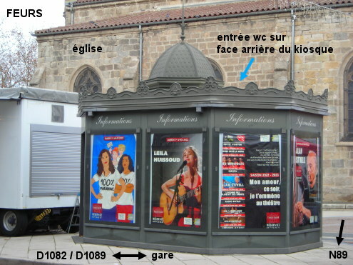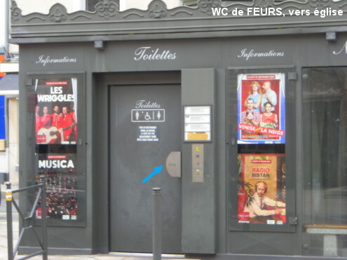 Ces toilettes sont situées à côté de l'église au bord de la D89. Elles se trouvent dans un petit bâtiment rectangulaire ressemblant aux anciens kiosques à journaux. Côté rue, à droite de la partie abribus, il y a des grandes affiches en façade sous une vitre, côté opposé donc en regard de l'église, il y a l'entrée des toilettes. Il s'agit d'une cabine WC à nettoyage automatique avec un lavabo dans lequel l'écoulement de l'eau est commandé par une cellule à détection. Pour trouver ces toilettes, à partir de la gare SNCF, sortir à gauche et continuer tout droit. Après un premier rond-point puis des feux tricolores, juste avant un deuxième rond-point (et avant l'intersection avec la D1082) on verra l'église côté droit et le bâtiment qui abrite les toilettes au bord de la route et d'une petite place (sur laquelle se tiennent des mini-marchés).