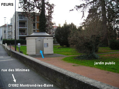 Ces toilettes se trouvent au bord du grand jardin public situé derrière l'hippodrome. Il s'agit d’une cabine WC à nettoyage automatique. A partir de l'intersection D1082 / D1089 / N89, sur la D1082 direction Montrond-les-Bains tourner soit dans la deuxième à gauche juste avant l'hippodrome (rue des Minimes) au début de laquelle il y a des statues de jockeys, soit directement dans la première à gauche (rue du Repos) qui débouche en T dans la rue des Minimes (à prendre côté gauche). Quelques mètres plus loin on verra à droite la cabine WC ovoïde en contrebas du trottoir et au bord d'un grand parc arboré.