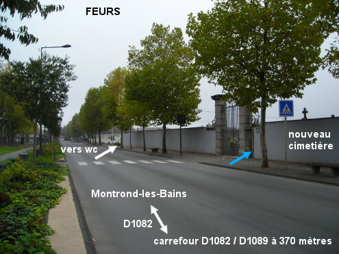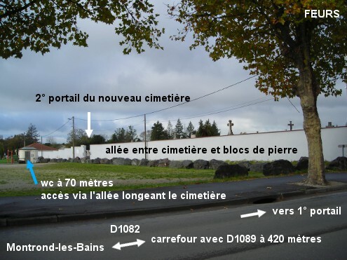 Ces toilettes se trouvent en face du portail latéral du nouveau cimetière, à l'entrée du parking situé à côté. Ce cimetière est implanté côté droit sur la D1082 direction Montrond-les-Bains, en face de l'hippodrome, à 370 mètres de l'intersection D1082 / D1089 (routes à très grande circulation). Si l'on entre par le portillon à droite du portail principal (côté route), on trouvera un robinet à droite. N.B. : Ce cimetière est ouvert de 7h30 à 20h du 01 avril au 31 octobre ou de 7h30 à 16h30 du 01 novembre au 31 mars. Pour trouver les toilettes, il faut continuer 50 mètres sur la D1082 et prendre à droite le chemin asphalté qui longe le côté gauche du cimetière, jusqu'au portail latéral. La cabine WC à nettoyage automatique est implantée à gauche du chemin, en face de ce portail et à l'entrée du parking en herbe. N.B. : L'écoulement de l'eau est commandé par une cellule à détection et dure longtemps, avec un jet très puissant. P.S. : On peut éventuellement emprunter l'allée séparée de la chaussée et longeant la D1082 côté hippodrome entre le cimetière et la rue des Minimes (il y a des statues de jockeys à l'angle).