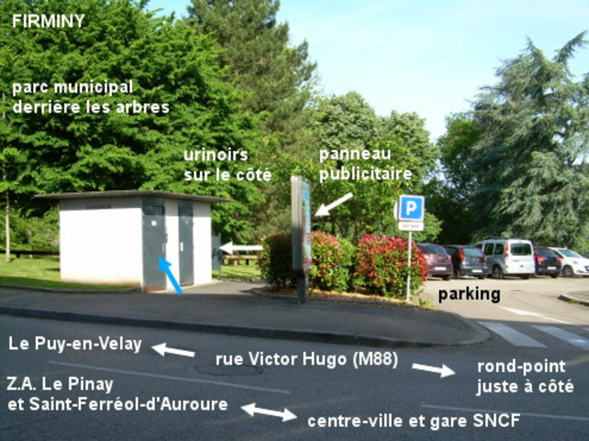 Ces toilettes se trouvent à proximité d'un des deux parcs municipaux, au bord de la grande artère qui traverse la ville (M88 direction Le Puy-en-Velay), près de l'entrée d'un parking et d'un rond-point. Il s'agit d'une cabine WC autonettoyante (il y a aussi des urinoirs à l'extérieur côté droit derrière le paravent) concernée par une fermeture nocturne de 22h à 6h. N.B. : Le lavabo-boite est la deuxième boite à partir de la droite et l'insertion du bidon à l'intérieur est plutôt acrobatique pour le placer sous le jet d'eau qui est commandé par une cellule à détection. 1) À partir de la gare SNCF, suivre le sens obligatoire par la droite pour prendre l'avenue de la Gare située en face de la gare. Aux feux tricolores, tourner à droite en direction du Puy-en-Velay (M88) et rouler tout droit jusqu'au rond-point. Prendre la deuxième sortie tout droit, puis juste après et derrière l'accès au parking monter à droite sur le trottoir pour découvrir derrière la panneau publicitaire le petit bâtiment des toilettes (à côté du parc municipal, et à 910 mètres de la gare). 2) En venant de Saint-Ferréol-d'Auroure (au carrefour sur la D6 où celle-ci fait un angle droit et où une rue adjacente conduit à la Mairie, prendre la direction opposée à la flèche ''D6 Firminy'' qui fait passer par la RN88, et rouler tout droit jusque vers la Z.A. du Pinay à la limite des deux communes) sur la petite route menant à Firminy, au premier rond-point prendre la première sortie (suivre la flèche ''site Le Corbusier'', on sera sur la M88) puis rouler tout droit jusqu'au troisième rond-point. Faire le tour complet de ce rond-point pour accéder ensuite aux toilettes côté droit juste après.