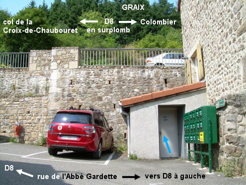 Les toilettes se trouvent dans un coin à côté de places de stationnement en contrebas de la D8, dans une rue secondaire dont les deux extrémités rejoignent la D8. N.B. : Le lavabo est trop petit pour glisser un bidon sous son robinet, mais on peut néanmoins se désaltérer avant de monter au col de la Croix-de-Chaubouret si on est en panne sèche. 1) Sur la D8 en provenance de Colombier et en direction du col de la Croix-de-Chaubouret, au niveau de la borne du point km 139 prendre la branche gauche du carrefour en Y et suivre la rue presque parallèle à la D8 qui descend en contrebas de celle-ci. Environ 40 mètres après, on découvrira le cabanon des toilettes à droite dans un coin derrière un grand bâtiment et avant quelques places de stationnement. P.S. : En continuant dans la rue, elle remonte et débouche sur la D8. 2) En provenance du col de la Croix-de-Chaubouret sur la D8, peu après le début du village, juste après l'abri d'un arrêt de bus, prendre la branche droite du carrefour en Y et descendre en contrebas de la D8 pour trouver le cabanon des toilettes à gauche après les places de stationnement, dans le coin avant le grand bâtiment à côté duquel il y a toute une série de boites-aux-lettres (à 70 mètres de la D8).