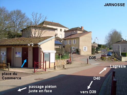 Les toilettes sont situées sur une place au centre du village située le long de la D40 direction Lagresle près du carrefour avec la D35. En provenance de Cuinzier sur la D39 puis la D40, au centre du village s'arrêter sur la place située côté gauche peu avant le carrefour à gauche avec la D35 direction Cours-la-Ville. Dans le grand bâtiment qui borde la droite de ladite place (sur son pignon côté D40 il y a un écriteau ''bienvenue à Jarnosse'' au-dessus d'un plan des environs) la deuxième porte en partant de la droite (à partir de la rue) est celle des toilettes. Elles ont été rénovées (date inconnue située entre mai 2021 et janvier 2025) et sont maintenant composées d'une unique grande cabine WC accessible aux handicapés.. N.B. : Une cellule à détection incluse dans le long corps vertical du robinet commande l'écoulement de l'eau.
