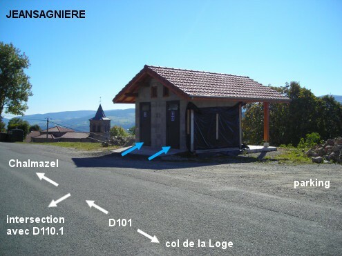 Le petit bâtiment des toilettes (construit en 2021) est situé sur le bord droit de la D101 en direction de Chalmazel, peu avant l'intersection à gauche avec la D110.1 en direction de La Côte-en-Couzan (intersection précédée d'une statue de Madone blanche du même côté). En arrière-plan sur la droite on voit l'église, et il y a un espace gravillonné de type parking avant le chalet des toilettes.