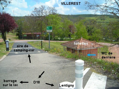 L'aire de camping-car de Villerest est située à côté de la plage et du barrage sur le lac de Villerest. Sur la D18 en provenance du bourg de Villerest et en direction de Commelle-Vernay, avant l'intersection avec la D84 direction Roanne et le pont sur le barrage, il y a à droite l'accès à l'aire de camping-car (à vélo on passe facilement à côté de la barrière qui se soulève barrant la passage aux véhicules non autorisés). Cette allée descend et fait un virage à droite. On aperçoit d'en haut le bâtiment des toilettes en bas du talus à droite. La cabine WC située à l'arrière du bâtiment (face au talus) et à gauche dispose d'un lavabo.
