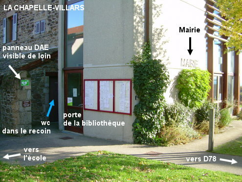 Les toilettes se trouvent dans un recoin entre l'école et la Mairie, dans le même bâtiment que la Mairie et à côté de la porte de la bibliothèque, qui sont situées au fond de la place à droite de laquelle est érigée l'église au bord de la D78. Sur la D78 en provenance de Condrieu, juste après l'église érigée côté droit prendre l'allée piétonne asphaltée qui est entre un mur et une série de potelets qui la protègent du parking qui est à gauche de l'église. Avancer jusqu'à arriver au niveau de la Mairie sise à droite (on verra l'école côté gauche) et faire encore quelques pas pour trouver juste après la porte de la bibliothèque sur le pignon gauche du bâtiment, le recoin dans lequel on découvrira la porte des toilettes (à 40 mètres de la D78). N.B. : Dans ces grandes toilettes d'aspect très récent, on dispose d'un grand évier rectangulaire.