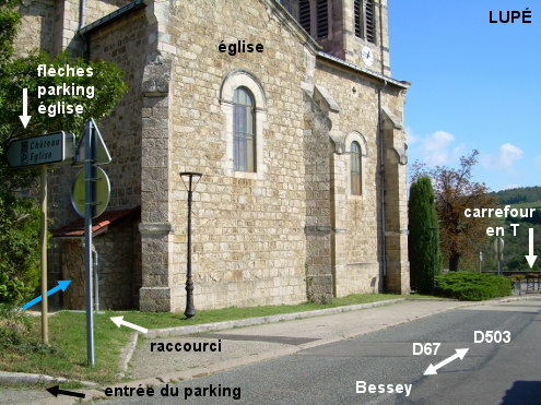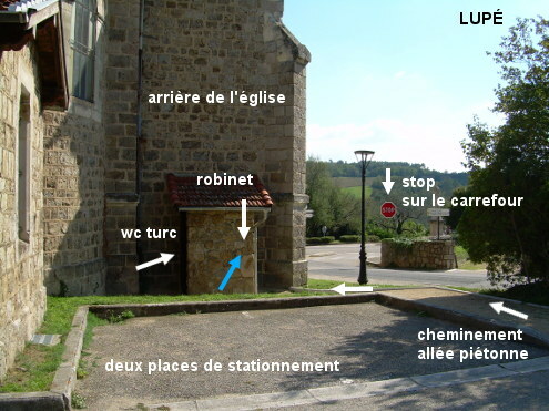 Les toilettes sont accolées à l'arrière de l'église qui est érigée à côté du carrefour D503 / D67. Le robinet est fixé sur le mur extérieur du cabanon des toilettes. 1) En provenance de Bessey sur la D67, juste avant le carrefour en T avec la D503 entrer à gauche sur le parking situé à l'arrière de l'église. Le cabanon en pierres des toilettes est tout de suite à droite, contre l'arrière de l'église. Le robinet est fixé sur le côté opposé à la D503, donc sur celui qui nous fait face. 2) En provenance de Malleval sur la D503, tourner à droite dans la D67 direction Bessey juste après l'église érigée dans l'angle de ce carrefour. Ensuite on peut soit entrer à droite sur le parking derrière l'église puis prendre à droite l'allée piétonne jusqu'au cabanon des toilettes (à 50 mètres du carrefour D503 / D67), soit prendre un raccourci en franchissant à pied le mètre d'herbe entre la route et le cabanon des toilettes.