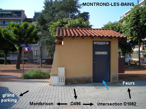 Les toilettes sont implantées au bord d'une immense place avec parking le long de la D496, et sont situées à 200 mètres de l'intersection avec la D1082 et à 220 mètres de la D115 direction Marclopt et du pont sur la Loire. En provenance de Marclopt par la D115, tourner à gauche dans la D496, peu après au niveau d'un ilot central décoré d'une fontaine ruisselante on verra sur la gauche une immense place (place de la République). Tourner à gauche juste derrière pour accéder au parking. Le petit bâtiment des toilettes est sur le bord droit de ladite place, proche du trottoir gauche de la rue perpendiculaire à la D496, à côté du Monument aux Morts. Il s'agit d'une cabine WC à désinfection automatique, dont le lavabo fonctionne avec une cellule à détection pour le déclenchement de l'écoulement d'eau.