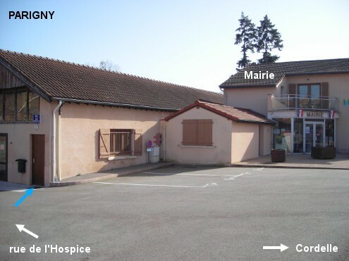 toilettes dans un bâtiment situé à proximité à gauche de la Mairie, à côté d'une place le long de la D45 et pas très loin de l'église