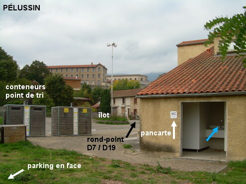 Ces toilettes se trouvent à proximité de deux écoles publiques situées près du rond-point sur la D7 au carrefour avec la D19 en direction de Chuyer (par D19 puis D30). Elles sont accolées au long bâtiment de l'ancienne gare sis à côté du rond-point et font face au parking qui est aussi devant les écoles. 1) En provenance de Chuyer sur la D30 puis la D19, au rond-point où la D19 se superpose à la D7, prendre la première sortie (D7 en direction du col de Pavezin et D19 direction Maclas) puis tourner aussitôt à gauche pour entrer sur la place au milieu de laquelle il y a un grand îlot circulaire et à droite de laquelle il y a un parking. Se diriger vers l'extrémité droite du long bâtiment qui est à gauche de l'accès au parking, monter sur le trottoir derrière les conteneurs du point tri pour le recyclage, afin de trouver l'entrée des toilettes qui fait face au parking (à 50 mètres de la D7). N.B. : Il faut appuyer énergiquement sur le bouton-poussoir situé sur le mur au-dessus du lavabo pour faire couler l'eau. 2) En venant de Maclas sur la D19, au carrefour avec la D7 sur l'extérieur d'un virage en épingle, tourner à droite en direction de l'Hôtel de Ville (et de Chavanay). La D19 et la D7 se superposent alors jusqu'au rond-point où elles se séparent. Juste avant ce rond-point on verra en hauteur un gros panneau « écoles publiques maternelle et élémentaire », prendre aussitôt à droite la voie menant au parking et à ces écoles pour trouver les toilettes comme en fin du point 1.