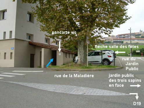 Ces toilettes se trouvent au nord de la ville en face du ''jardin public des Trois Sapins'' et à l'angle avec la rue menant à la salle des fêtes (fléchée), et sont situées à 60 mètres de la D19 direction Chuyer (D19 puis D30). 1) En provenance de La Chapelle-Villars sur la D78 (ou Chuyer sur la D30) puis la D19, après le carrefour en Y avec sur la branche droite la direction du Quartier des Croix, à la fin du grand jardin public aménagé côté droit, tourner à droite (rue du Jardin Public) puis juste après à gauche en direction de la salle des fêtes. S'arrêter aussitôt pour trouver côté droit au début de la rue, l'entrée des toilettes qui sont accolées à droite du premier immeuble. N.B. : Il n'y a pas de lavabo mais il y a un robinet dans le coin à droite de l'entrée et à droite des urinoirs. 2) En provenance de Maclas sur la D19, celle-ci rejoint la D7 sur l'extérieur d'un virage en épingle et se superpose à elle, tourner à droite en direction de l'Hôtel de Ville (et de Chavanay). Puis au rond-point où la D7 et la D19 se séparent, prendre la suite de la D19 : la troisième sortie en direction de Chuyer. Tourner ensuite dans la première à gauche (carrefour en croix peu après le collège sis côté droit), puis s'arrêter au coin de la rue adjacente à gauche pour trouver les toilettes côté droit au début de cette dernière rue (rue de la Maladière).