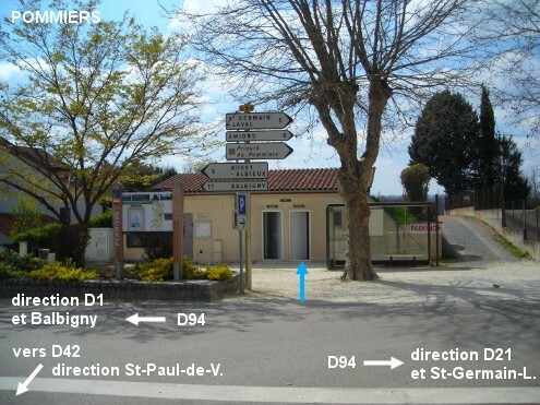 Les toilettes sont situées sur une place le long de la D94, côté gauche en direction de St-Germain-Laval, et face à l'intersection avec la D42 (route de la Tuilerie) direction St-Paul de Vézelin.